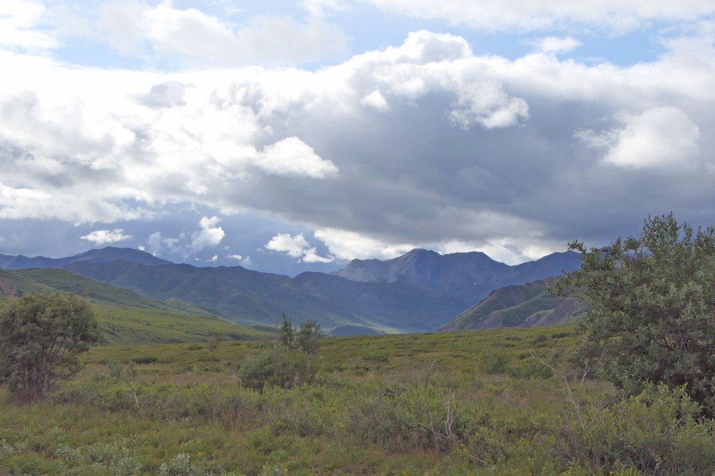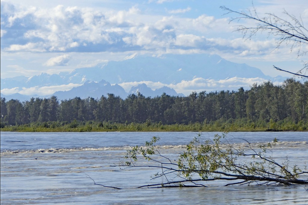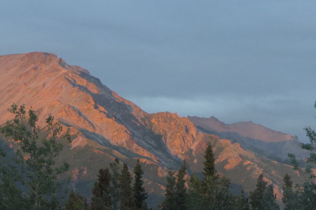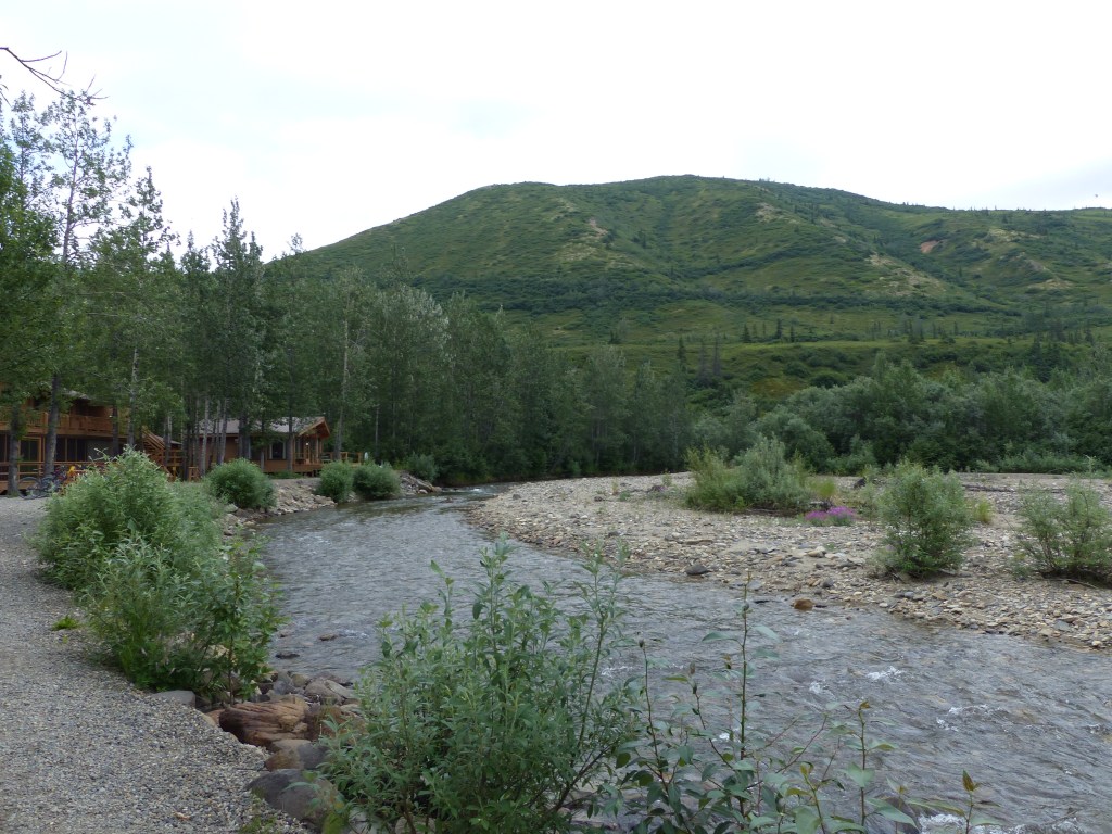 After dinner that day we noticed that the clouds had thinned so we made another trip to the river to see if Denali was visible. Most of it was (it’s the big gray shape in the back) with the top still in the clouds.