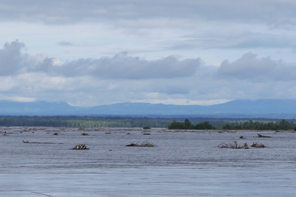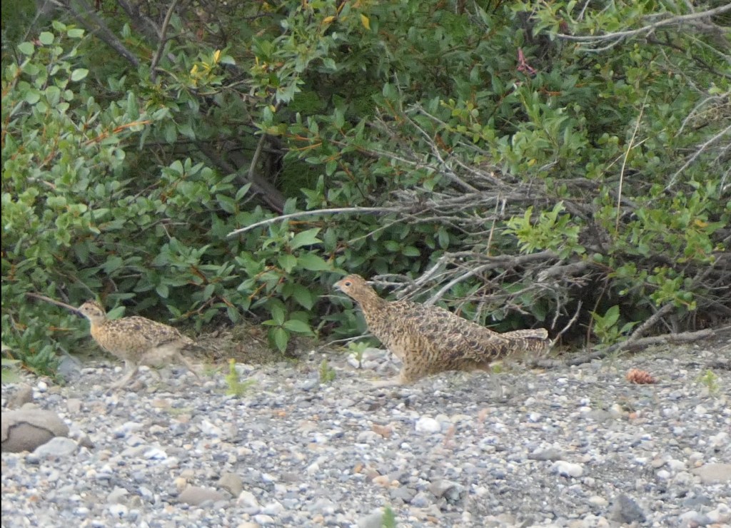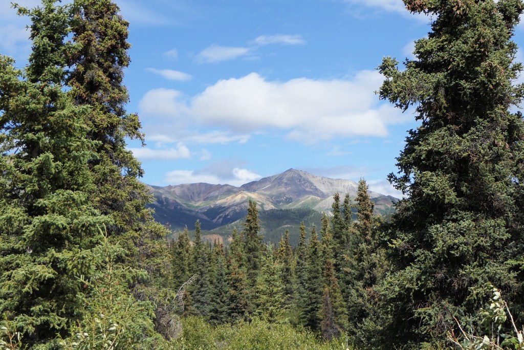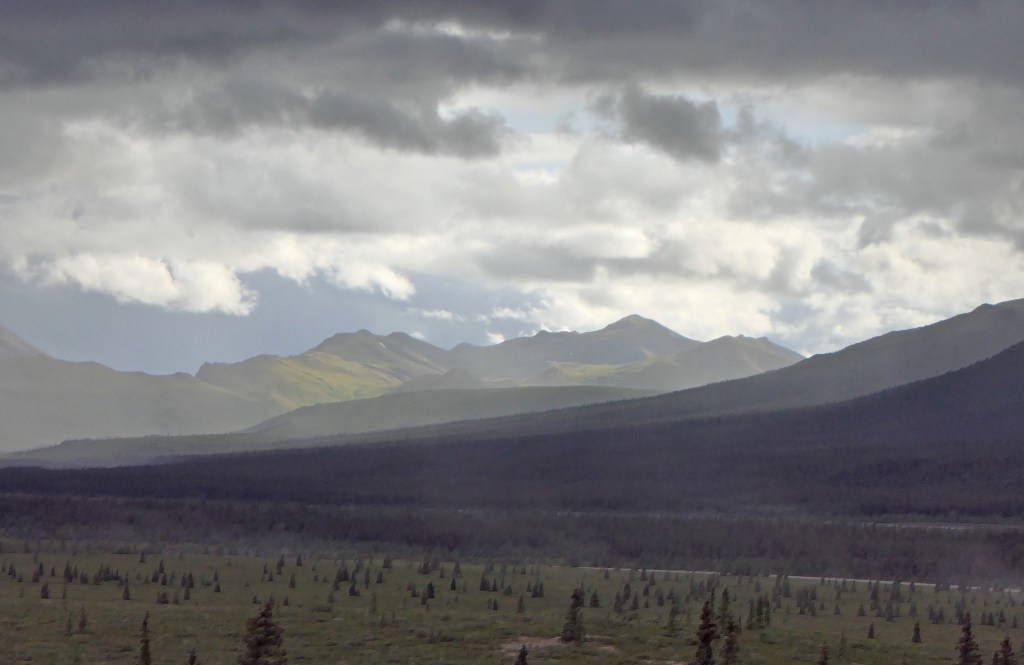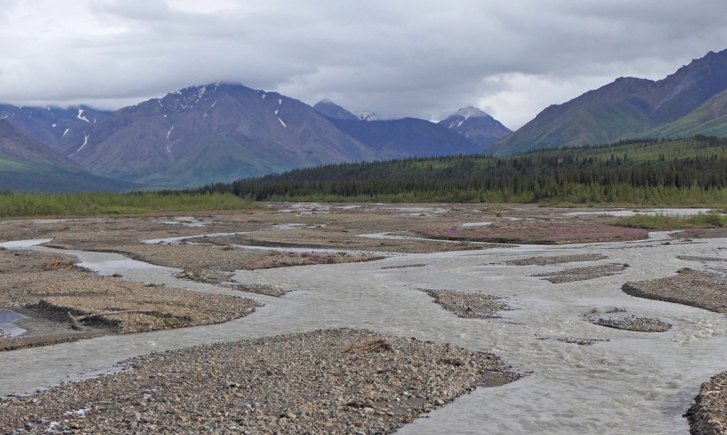 After dinner that day we noticed that the clouds had thinned so we made another trip to the river to see if Denali was visible. Most of it was (it’s the big gray shape in the back) with the top still in the clouds.