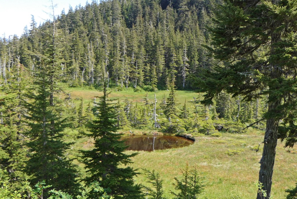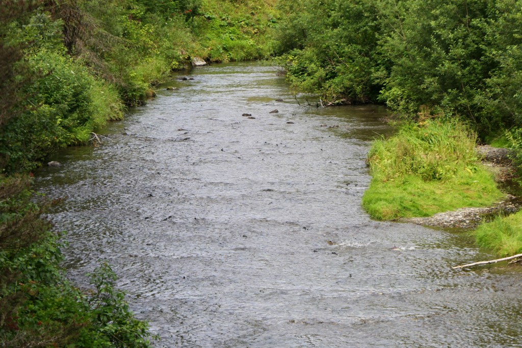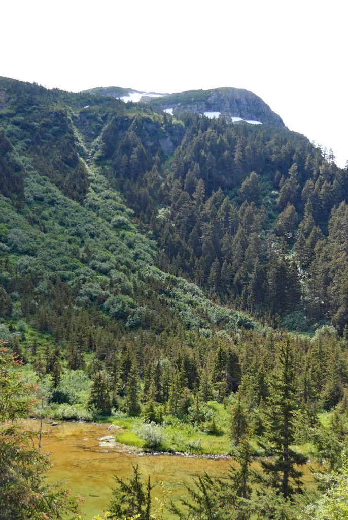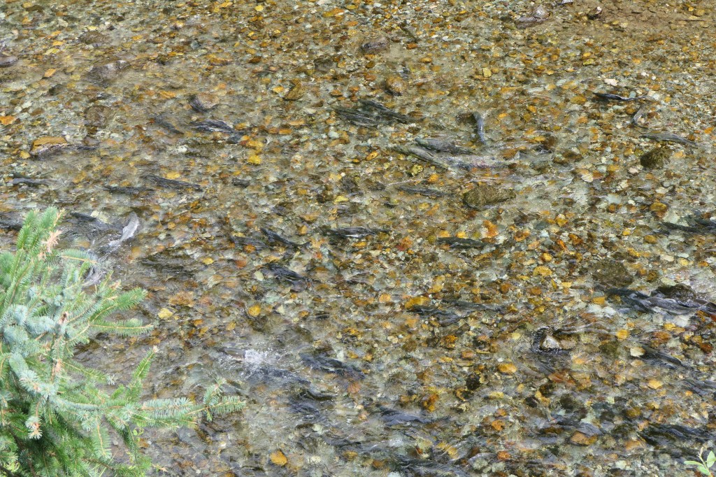 Other than her great food and the homemade fudge at a little gift shop nearby, one of the big draws now is the salmon stream, Fish Creek. On Fish Creek, the Tongass National Forest has a bear viewing platform, where the bear come in to feed on the spawning chum (also called dog) salmon that are easy pickings. They are called that because they are not all that great for us humans to eat. We didn’t see any bear (missed one by ~10 minutes), but the views of the unbelievable numbers of salmon spawning were really cool. All the little black marks in this picture are a salmon writhing their way up stream. Some people stay there all day, trying to catch a glimpse of the bears feeding.