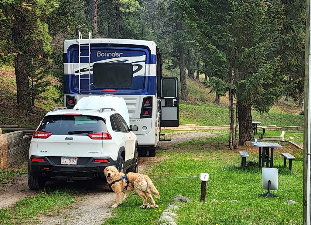 Yes, the lake really is that incredible shade of blue. We have a layover day here tomorrow when we plan to check out the nearby hot springs, and let Beau have a few more swims. Our site is right overlooking the lake, doesn’t get much better than that! On the down side, we’re having technical difficulties (again) with the leveling system that was supposedly fixed during the extended repair session since last June.