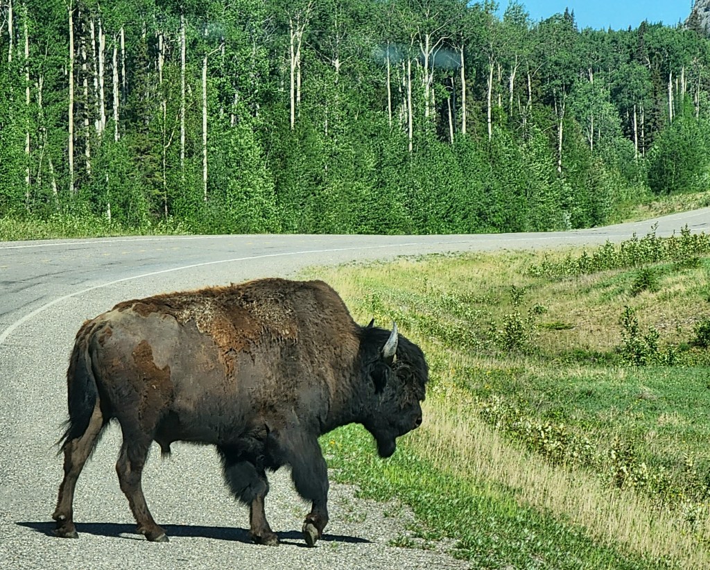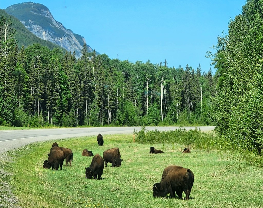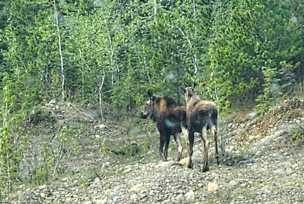 We left British Columbia behind today for the Yukon Territory. It was a day of wildlife sightings. Three moose, three black bears (one alone and a mother and cub), a young grizzly, and a ton of bison! It is difficult to get a lot of good pictures because the turnouts are rarely where the great views or the wildlife are, and traffic – while sparse – is moving along at highway speeds.