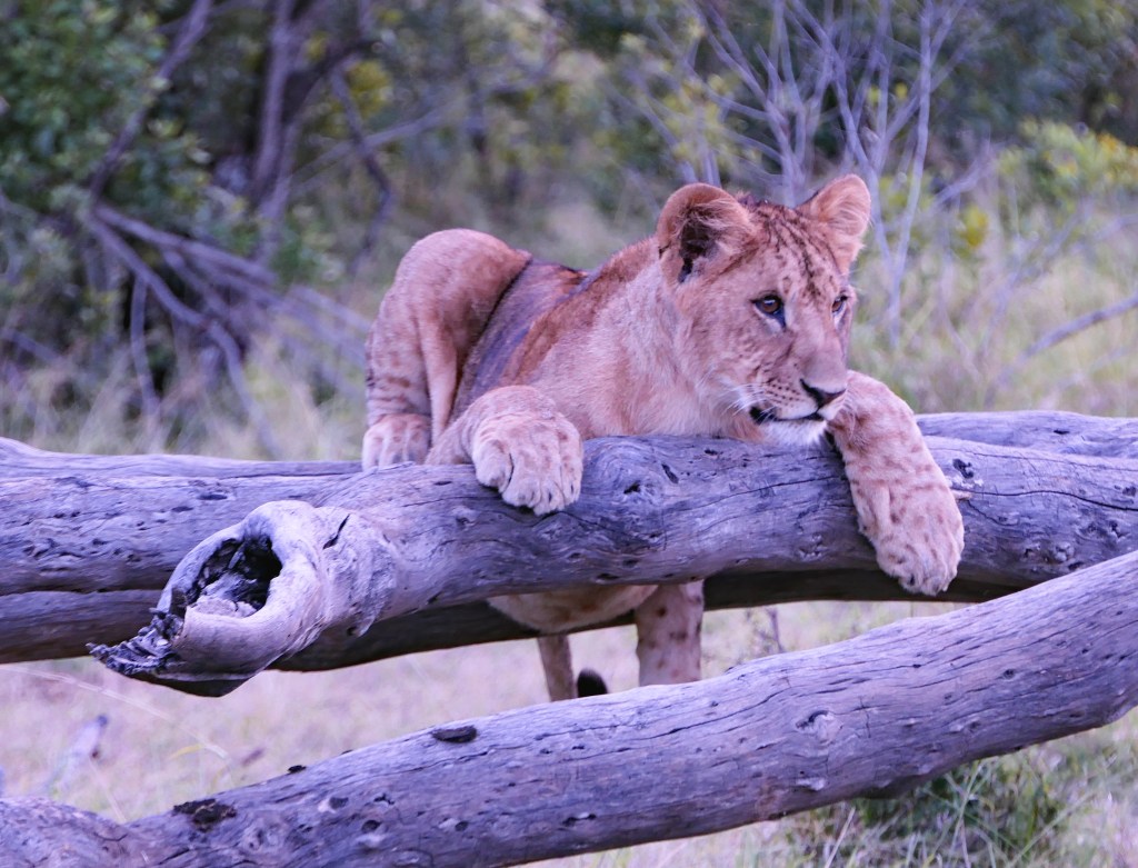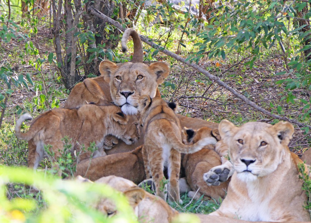 As sunset was approaching, Duma heard that a pride of lions was sighted so off we went to scour the bush looking for them. I caught a movement under a tree and there they were, waking up from their afternoon nap. There were four females and cubs and subadults, 12 in all. The cubs were getting rambunctious, playing with each other and the adults.