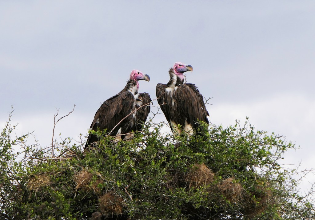 After lunch, 800 mg of ibuprofen, and another nap we went out for the afternoon game drive. The first thing we saw were these Lappet-faced Vultures in the tree top.