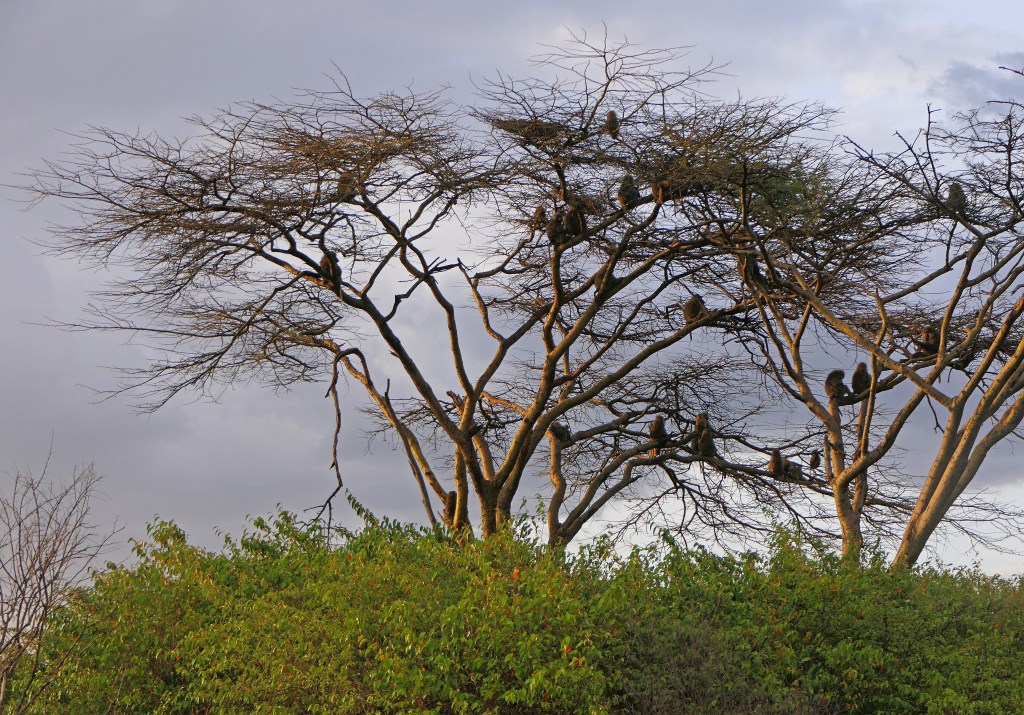 A troop of baboons taking refuge in a tree to stay safe from the lions.