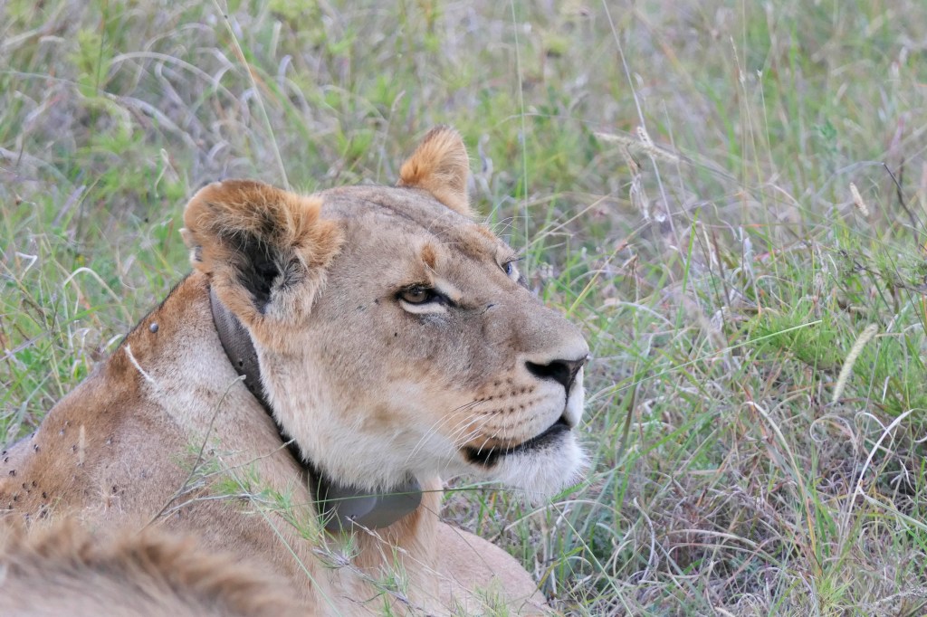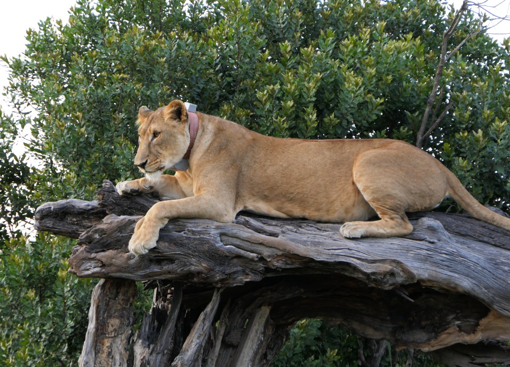 As the sun sunk began to set the pride went off to start their evening activities. This female had a radio collar.