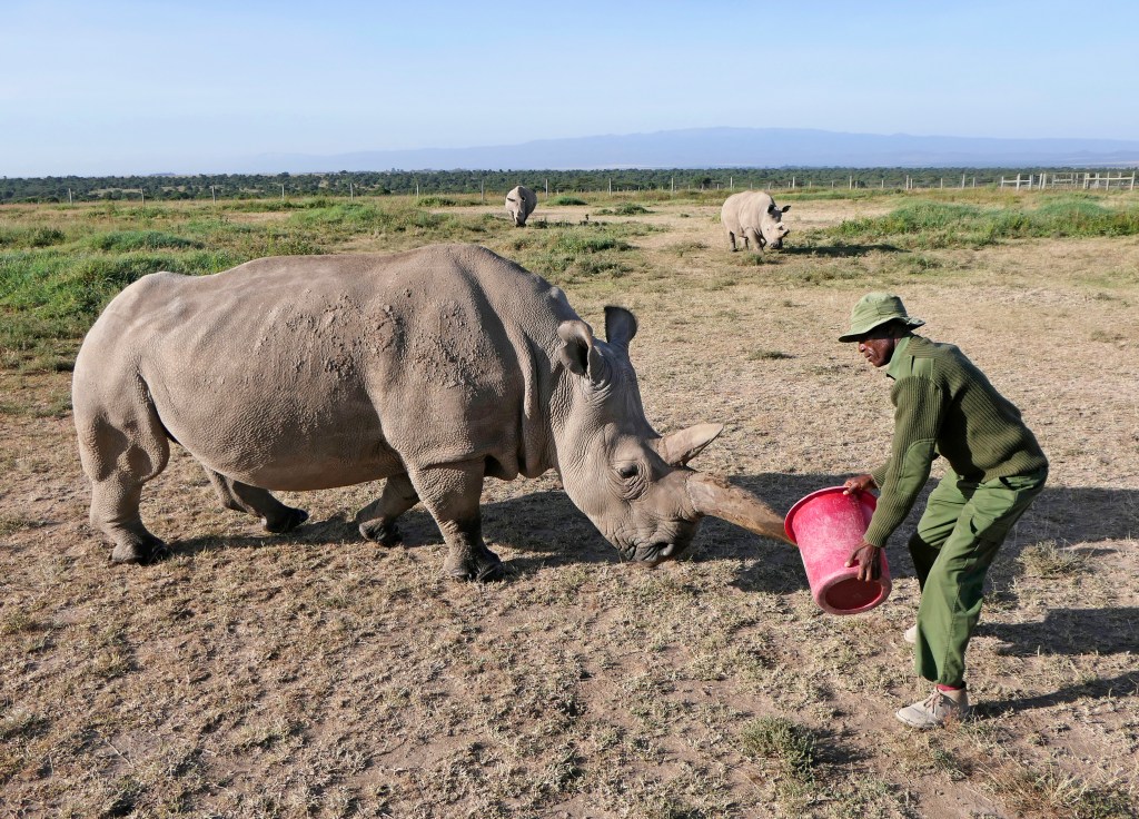 Efforts to have them breed with each other and with Southern White Rhinos both failed and it was determined that neither female could bear young. However, eggs were harvested from both females and sperm had been frozen from the males prior to their death, and some eggs were fertilized successfully with the sperm. The embryos have been stored in liquid nitrogen since 2020. Their keeper told us that this year, as soon as some of the enclosed wild female Southern White Rhinos come into season, the embryos will be implanted in the surrogates with hopes of some baby Northern White Rhinos in the future. The two girls live with a female best friend, a Southern White Rhino.