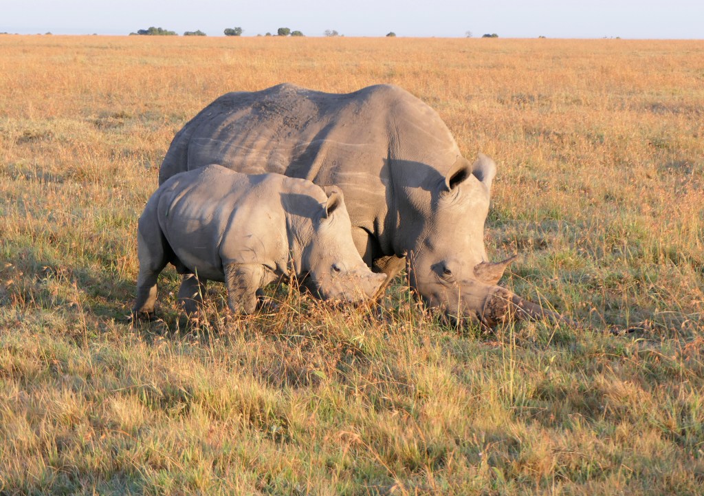 Mom and baby Southern white rhinos. Rhinos are the second largest land mammal; only the elephant is larger and heavier.