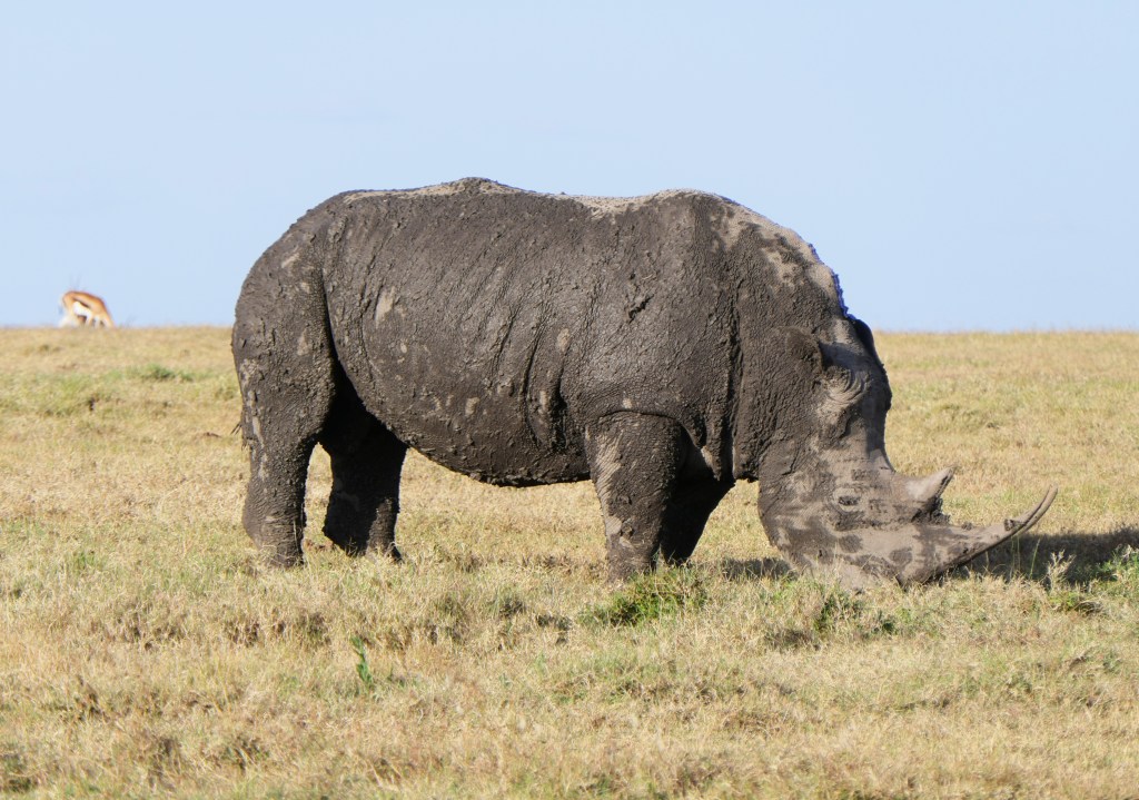 A very muddy rhino! Rhinos, hippos, warthogs, buffalo, and elephants use the mud wallows to cool themselves, and to battle insects and parasites.